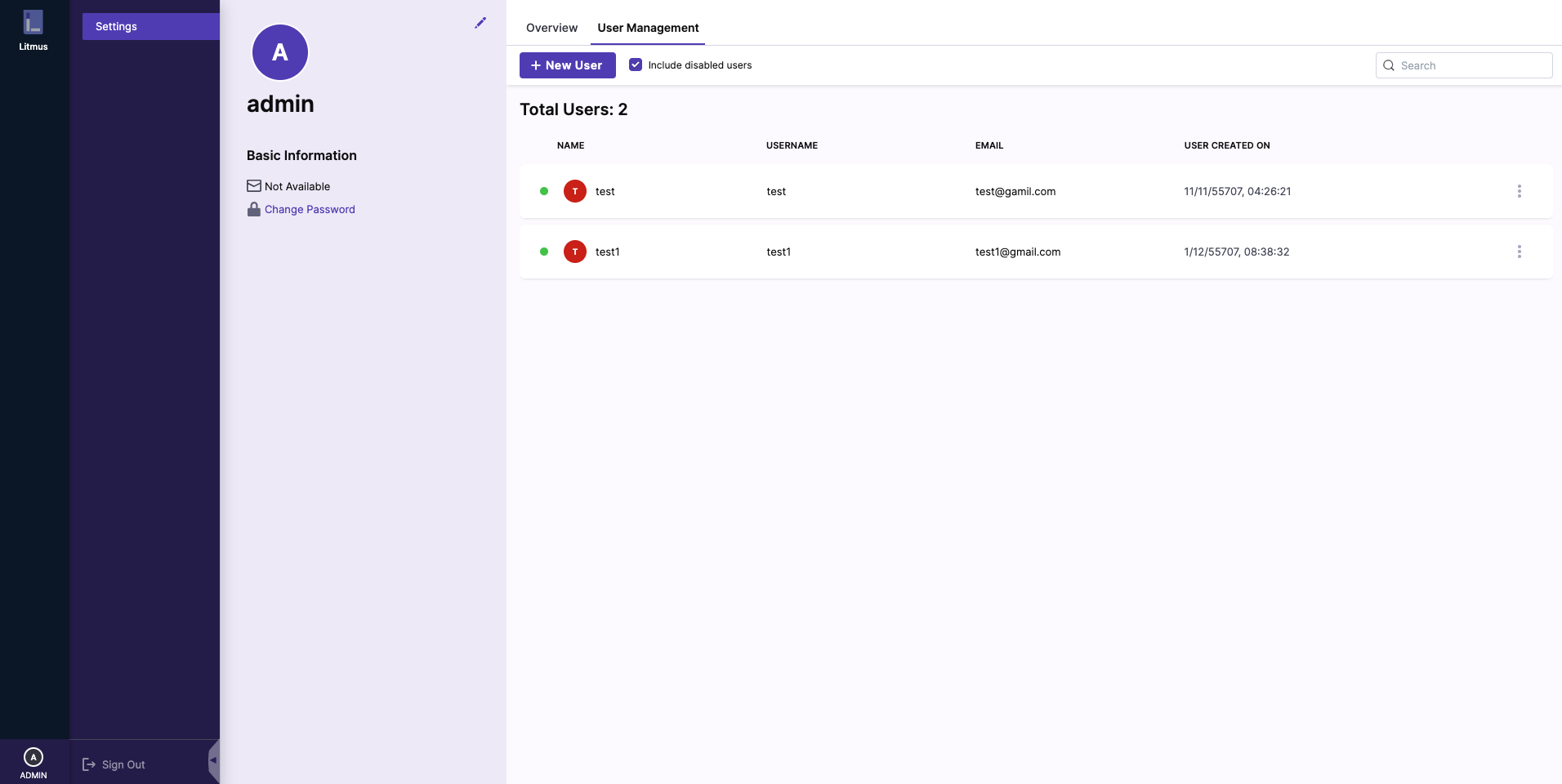 In the Settings page, the User Management tab can be used to access the user management feature by the admin. We recommend learning about the concept of user management before proceeding with the following user guides.