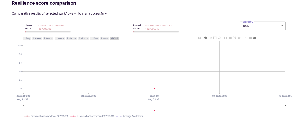 Once, user clicks on Compare Chaos Scenario button, they will be presented with a graph, which shows comparison of selected chaos scenarios with respect to resilience score.